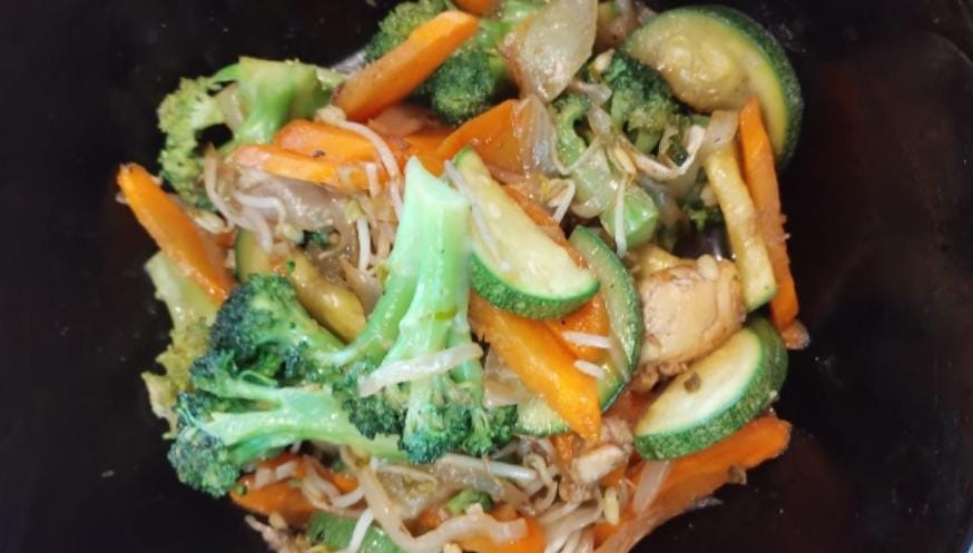 Platillo de vegetales con salsa especial y proteína a escoger, base de arroz blanco.