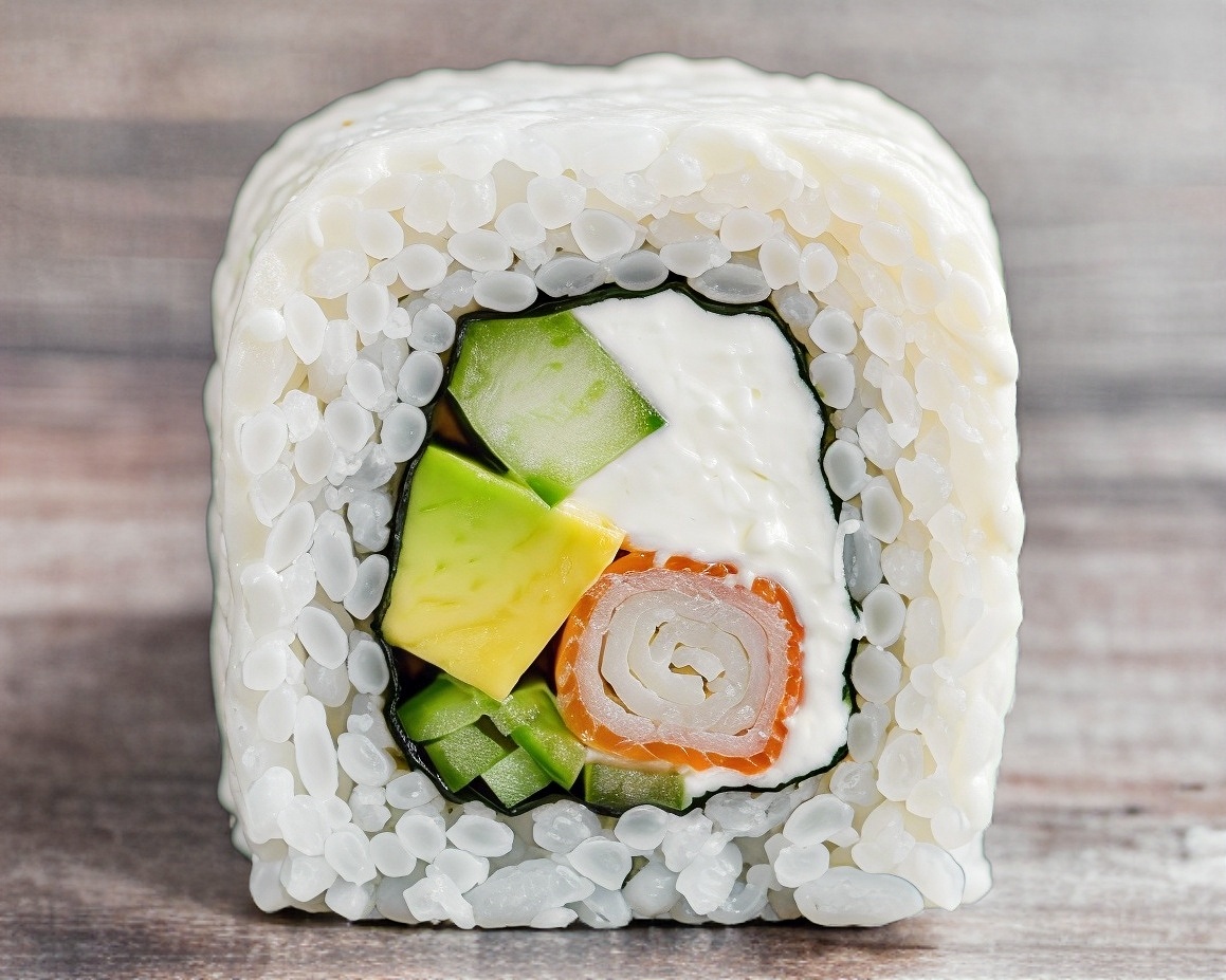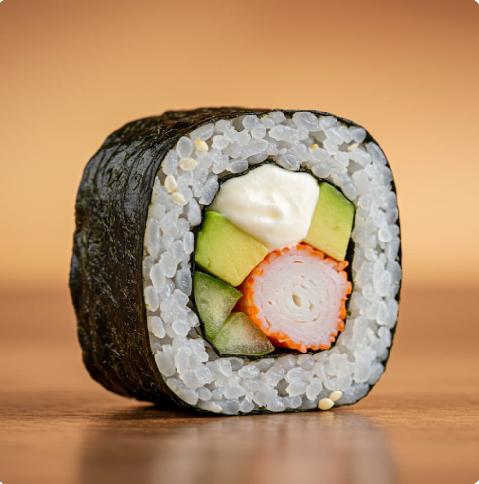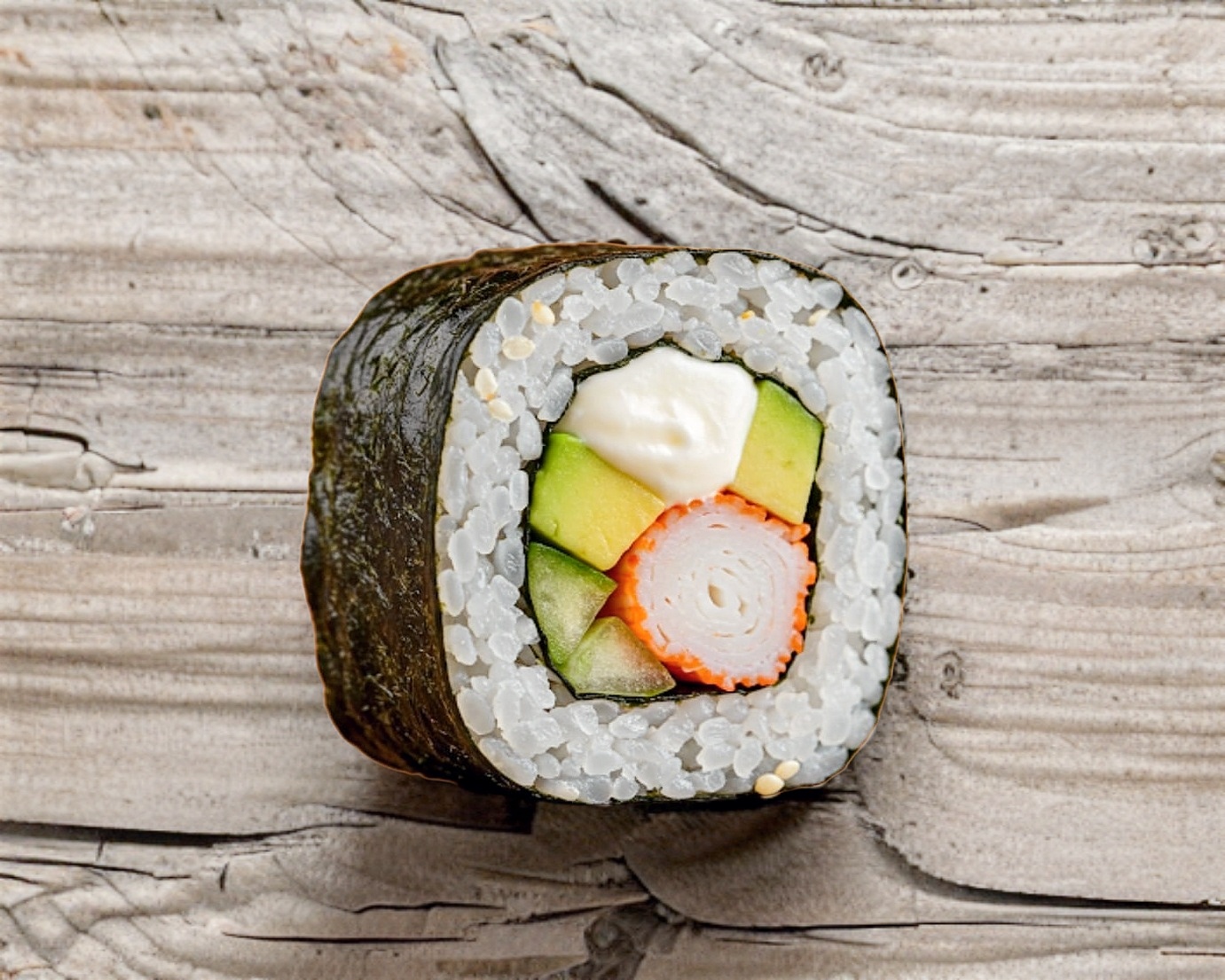 Por fuera queso crema, por dentro alga marina, queso crema, pepino, aguacate y proteína a elegir.