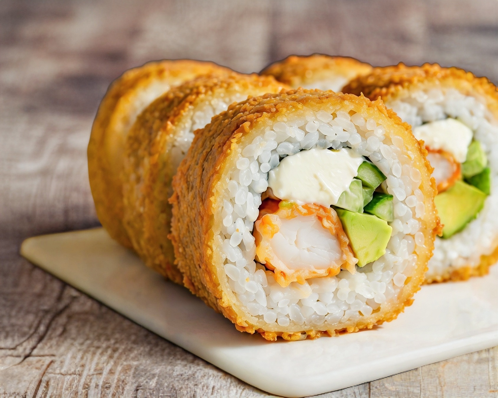 2 Sushis empanizados por fuera, al centro alga marina, queso crema, pepino, aguacate y proteína a elegir.