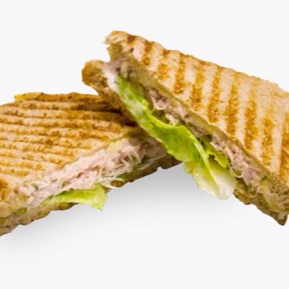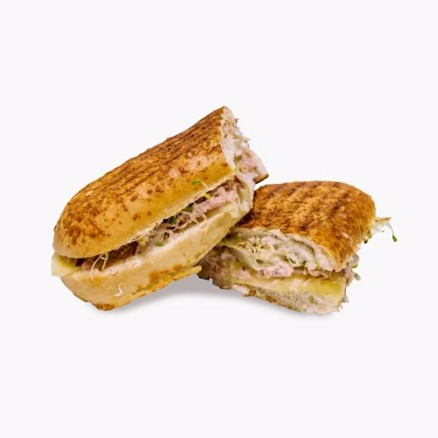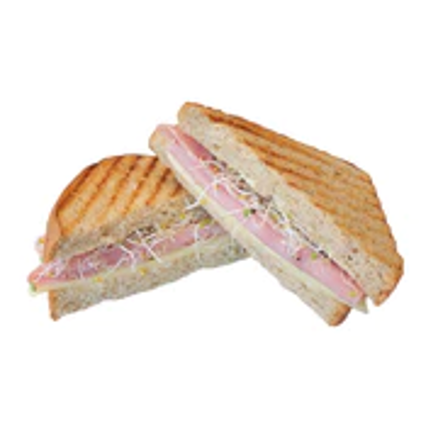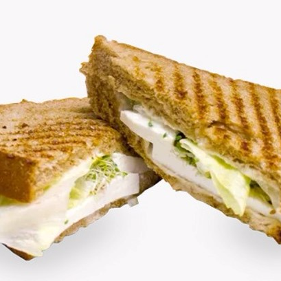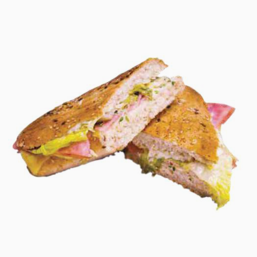 Panini de jamón de pavo con queso manchego, mayonesa, germinado y lechuga.