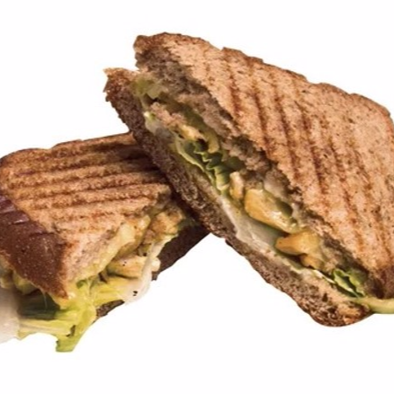Panini de pollo con queso manchego, mayonesa, germinado y lechuga.