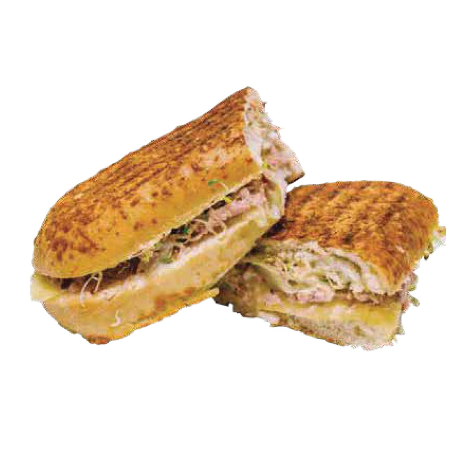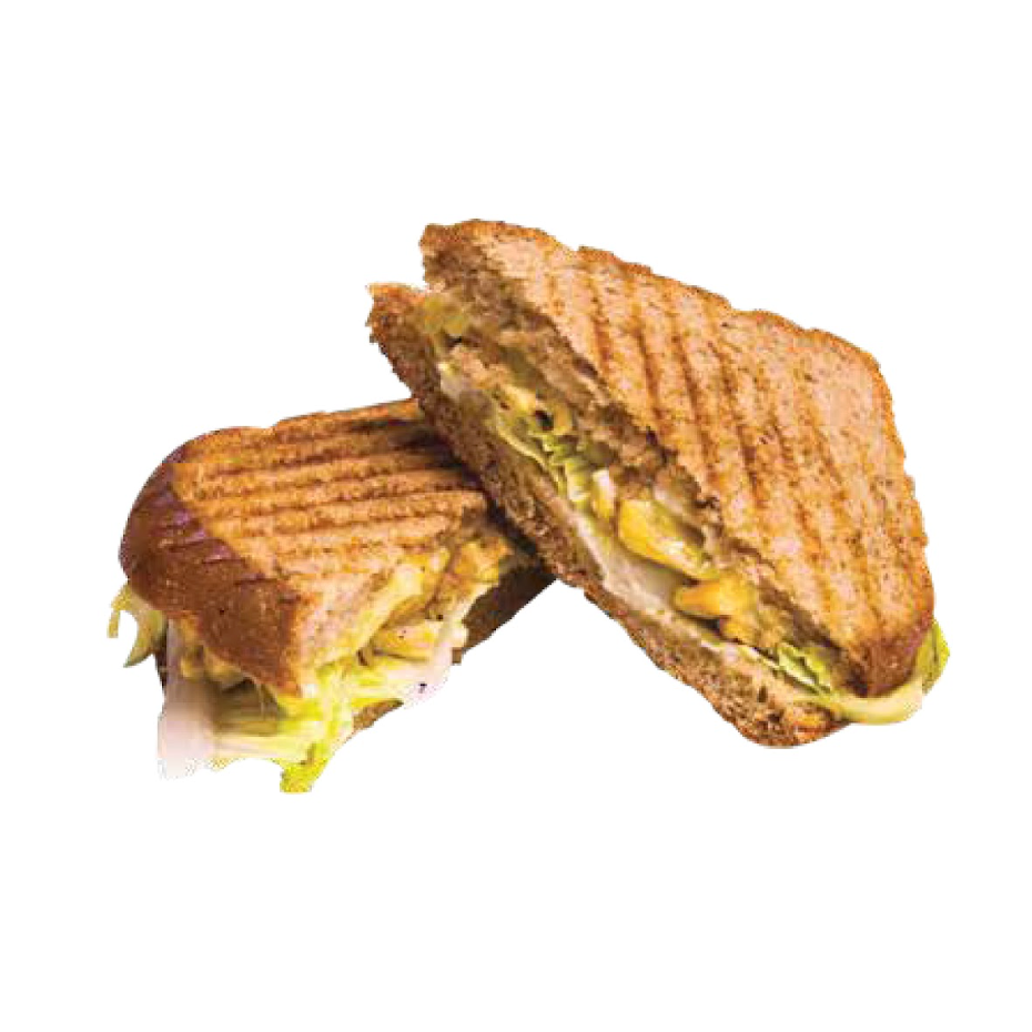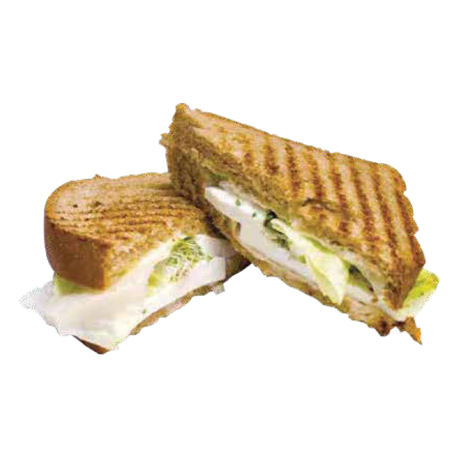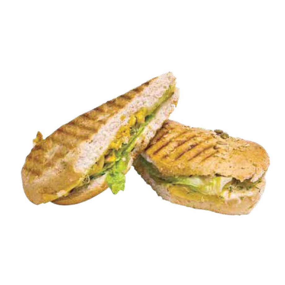 Panini de pollo con queso manchego, mayonesa, germinado y lechuga.
