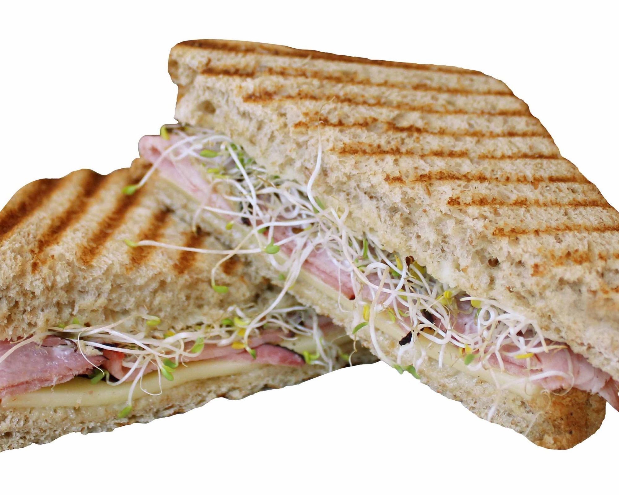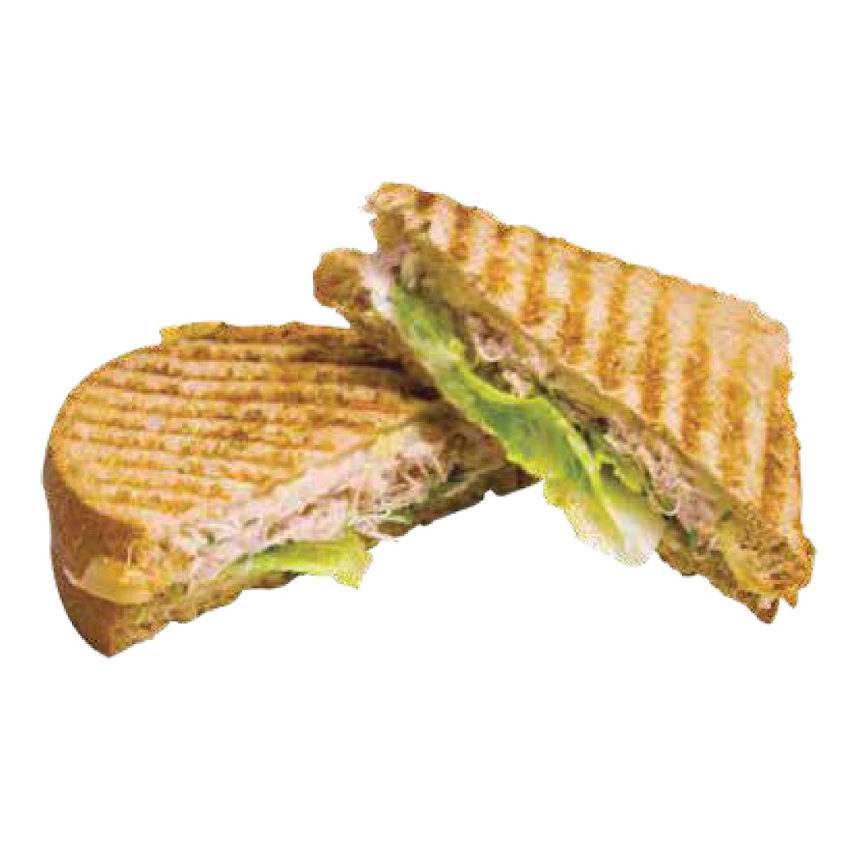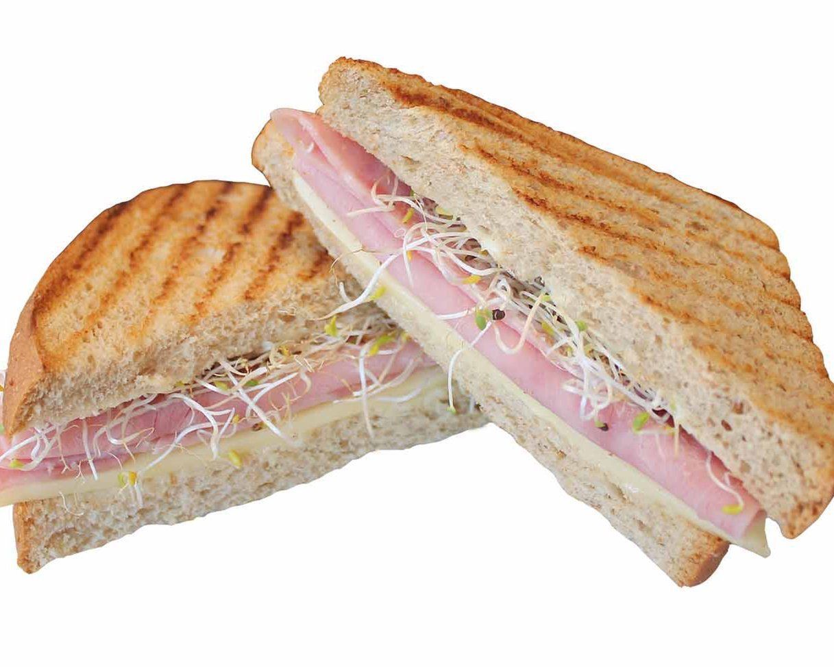 Panini de jamón de pavo con queso manchego, mayonesa, germinado y lechuga.