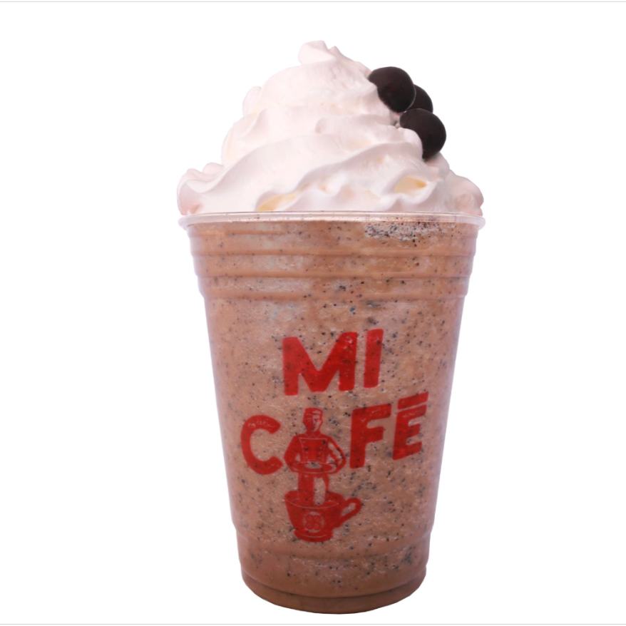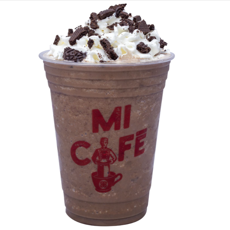 Frappé de café con Oreo, decorado con crema batida y una galleta Oreo.