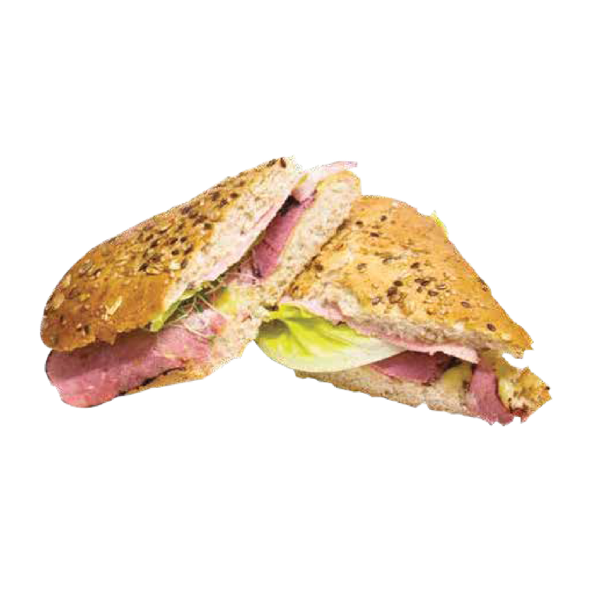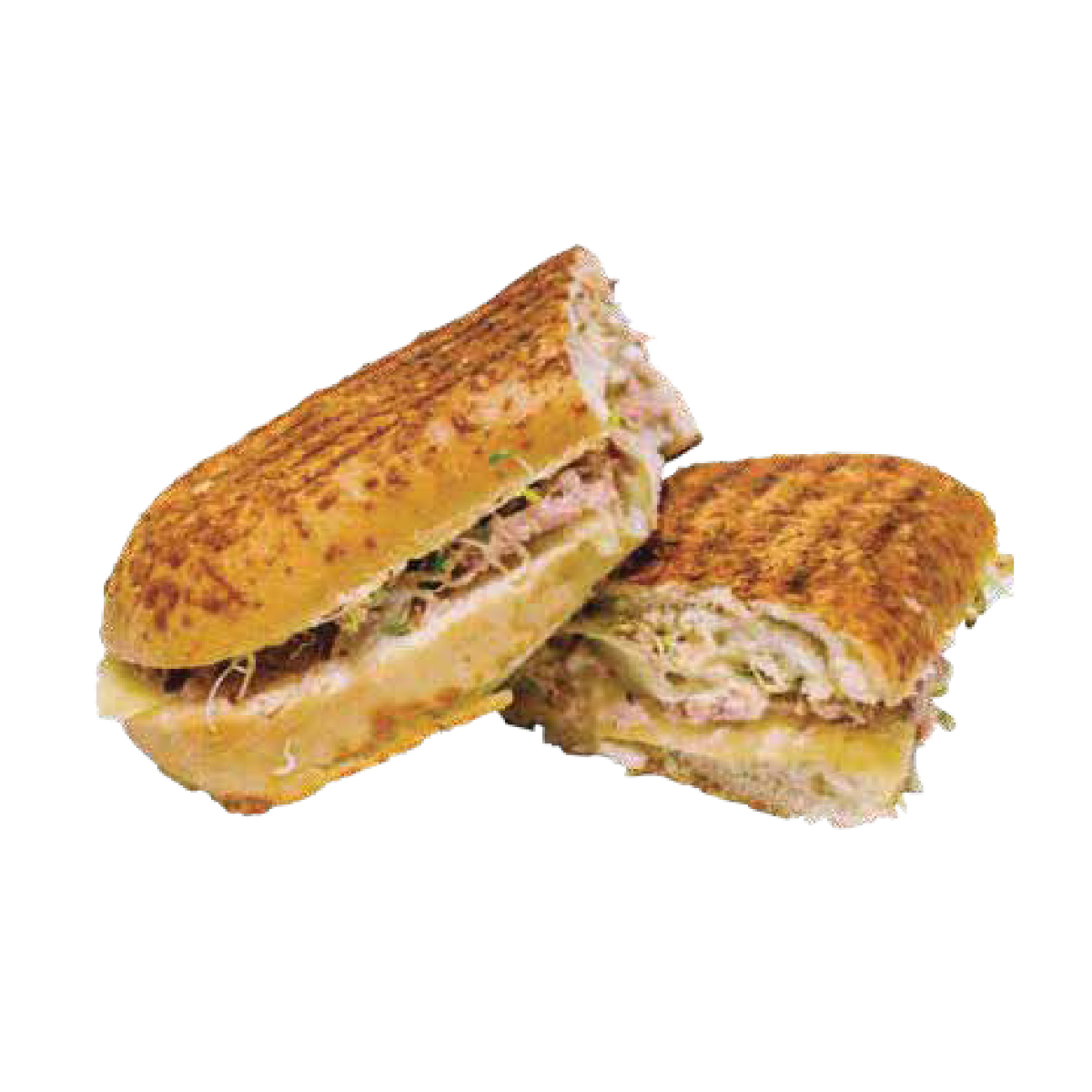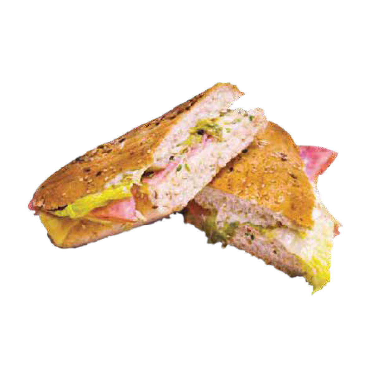 Panini de jamón de pavo con queso manchego, mayonesa, germinado y lechuga.
