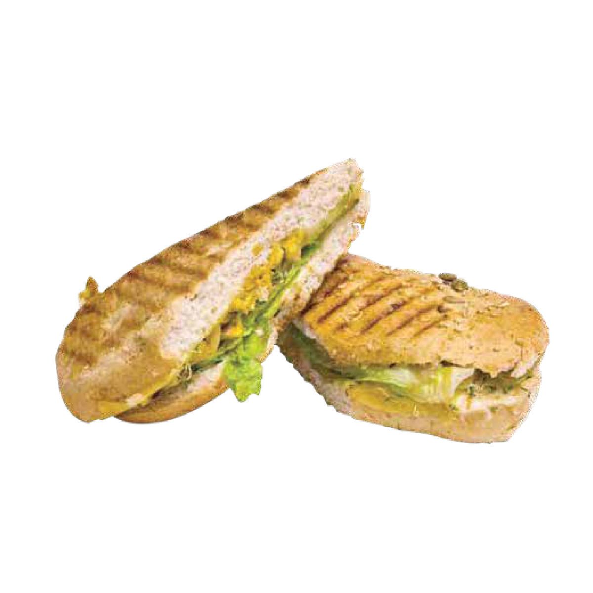 Panini de pollo con queso manchego, mayonesa, germinado y lechuga.