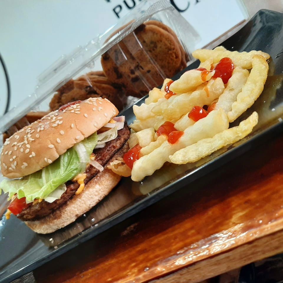 Carne de res, lechuga, jitomate, cebolla, queso y orden de papas a la francesa.