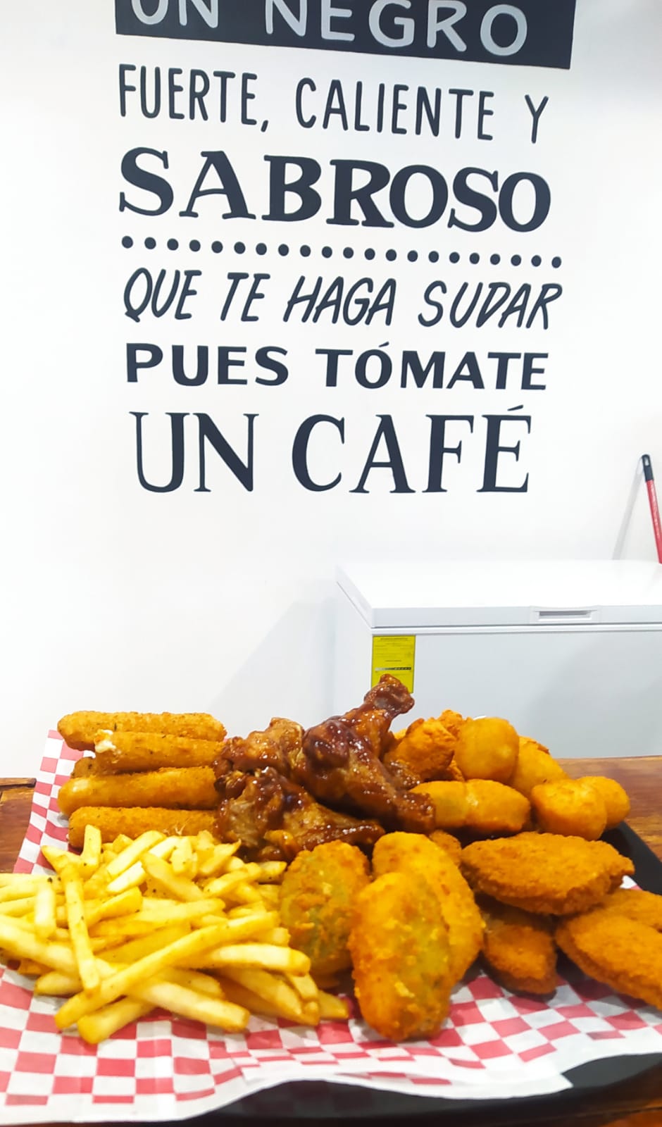5 Alitas, 100 gramos de papas a la francesa, 100 gramos de papas gajo, 5 jalapeños con queso, 3 dedos de queso y 100 gramos de boneles.