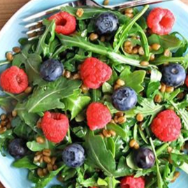 Base de hojas verdes, con frutos rojos, queso panela y nuez.