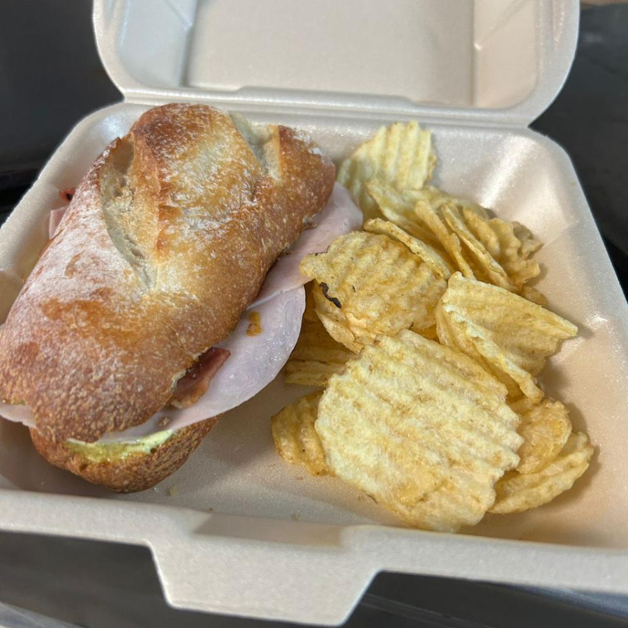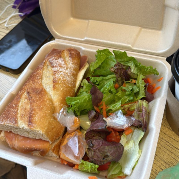 Pan baguette de masa madre con tocino dorado, jamón, cebolla caramelizada y queso fundido. Acompañado de papas doradas o ensalada.