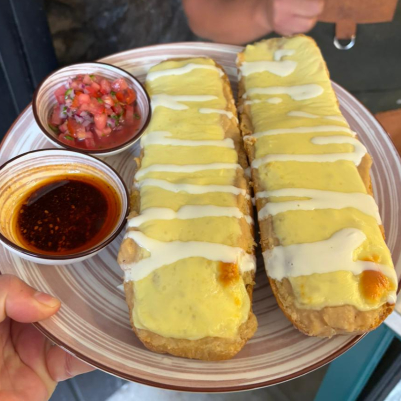 Base de frijol gratinados con queso asadero, acompañado de salsa mexicana.
