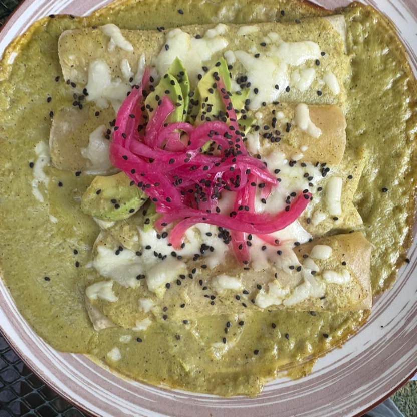 Suaves tortillas bañadas en salsa de frijol, rellenas a elegir de pollo deshebrado o queso, coronadas con un toque de crema de rancho.