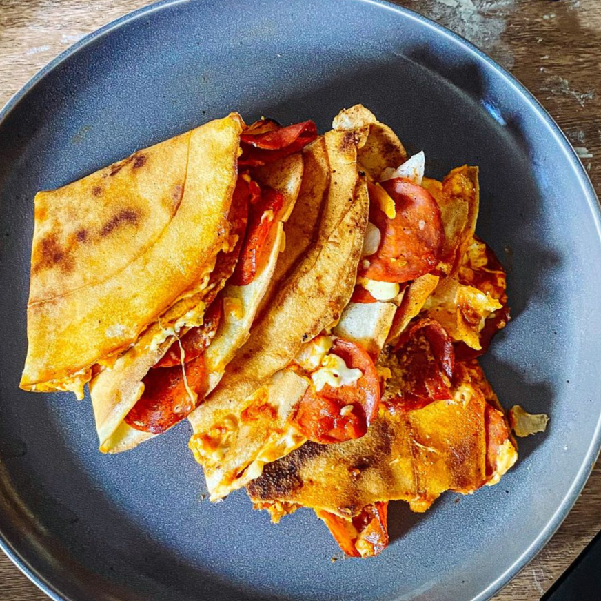 Base de salsa para pizza, peperoni doradito y queso a elección