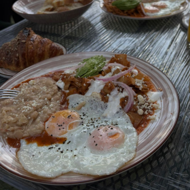 Chilaquiles con salsa verde o roja a elegir, con frijoles fritos y birote. Acompañados con mingiche típico de Mazamitla.