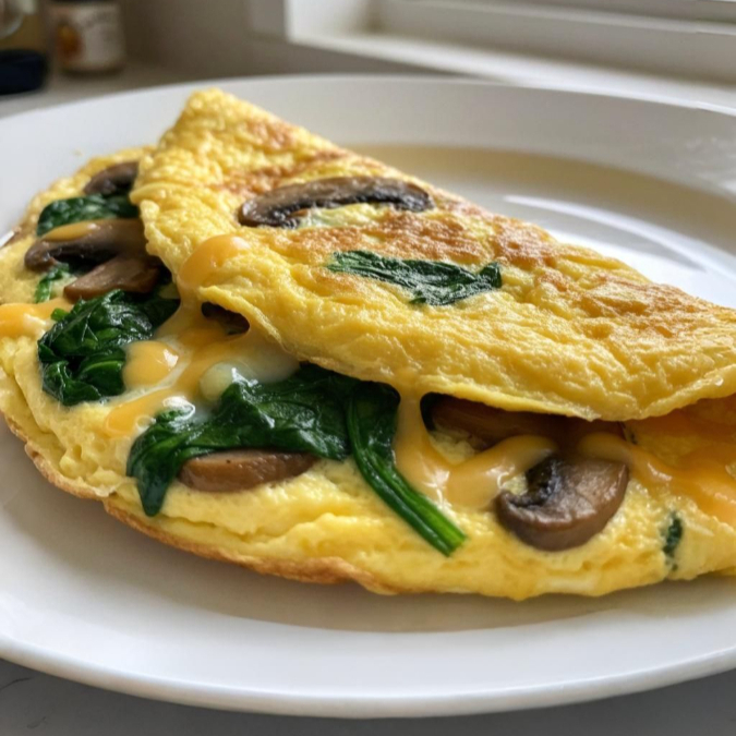 Esponjoso omelette recién hecho, relleno de champiñones salteados, espinacas frescas, tocino crujiente, queso derretido y elote. Acompañado de frijoles fritos.