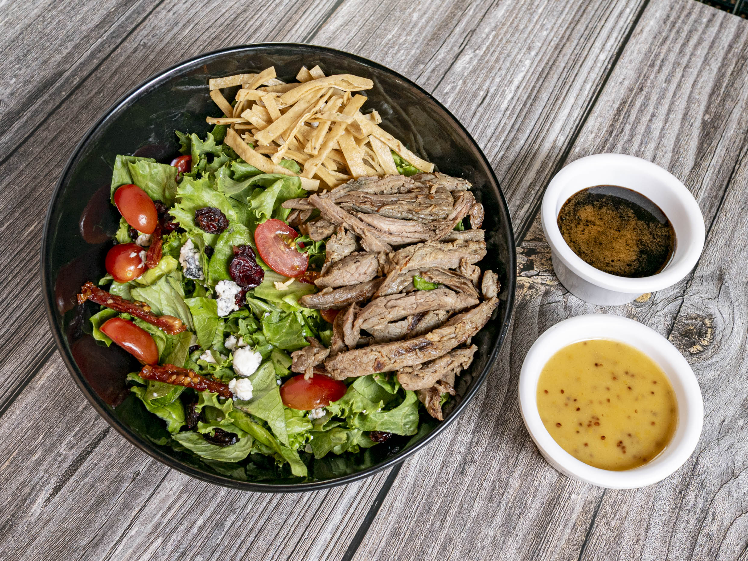 Lechuga mixta con arrachera, queso de cabra, tomate cherry, tomate deshidratado y arándanos: coronado con julianas y vinagre balsámico.