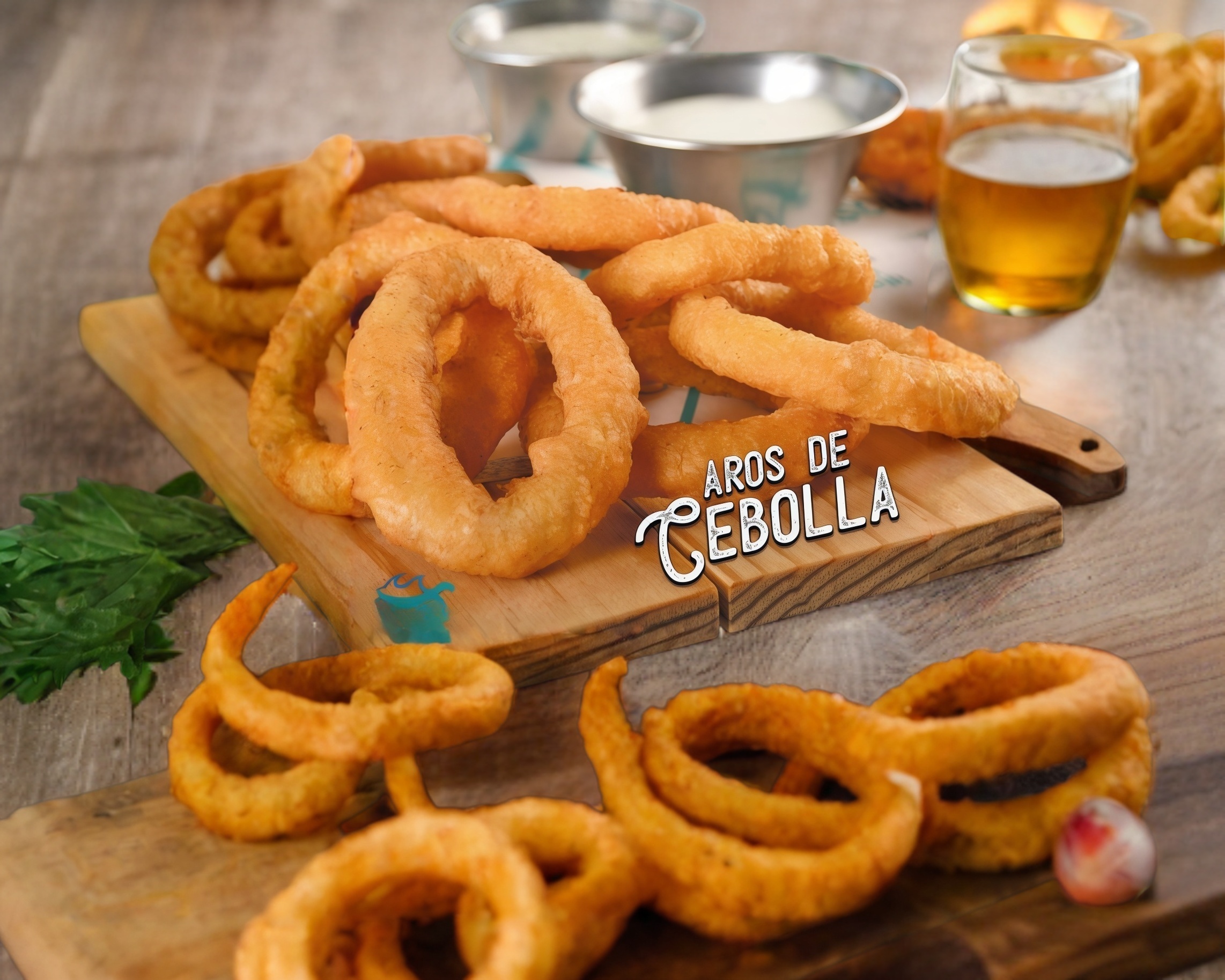 Deliciosos, clásicos y perfectos aros de cebolla, con aderezo de tu preferencia