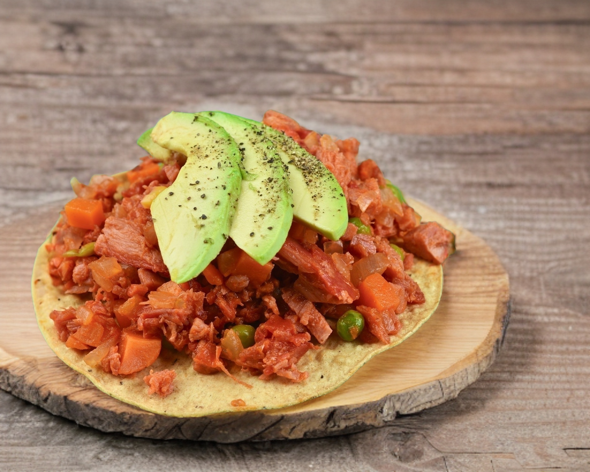Rico marlin guisado con vegetales y un toque de chipotle sobre una tostada coronada con aguacate