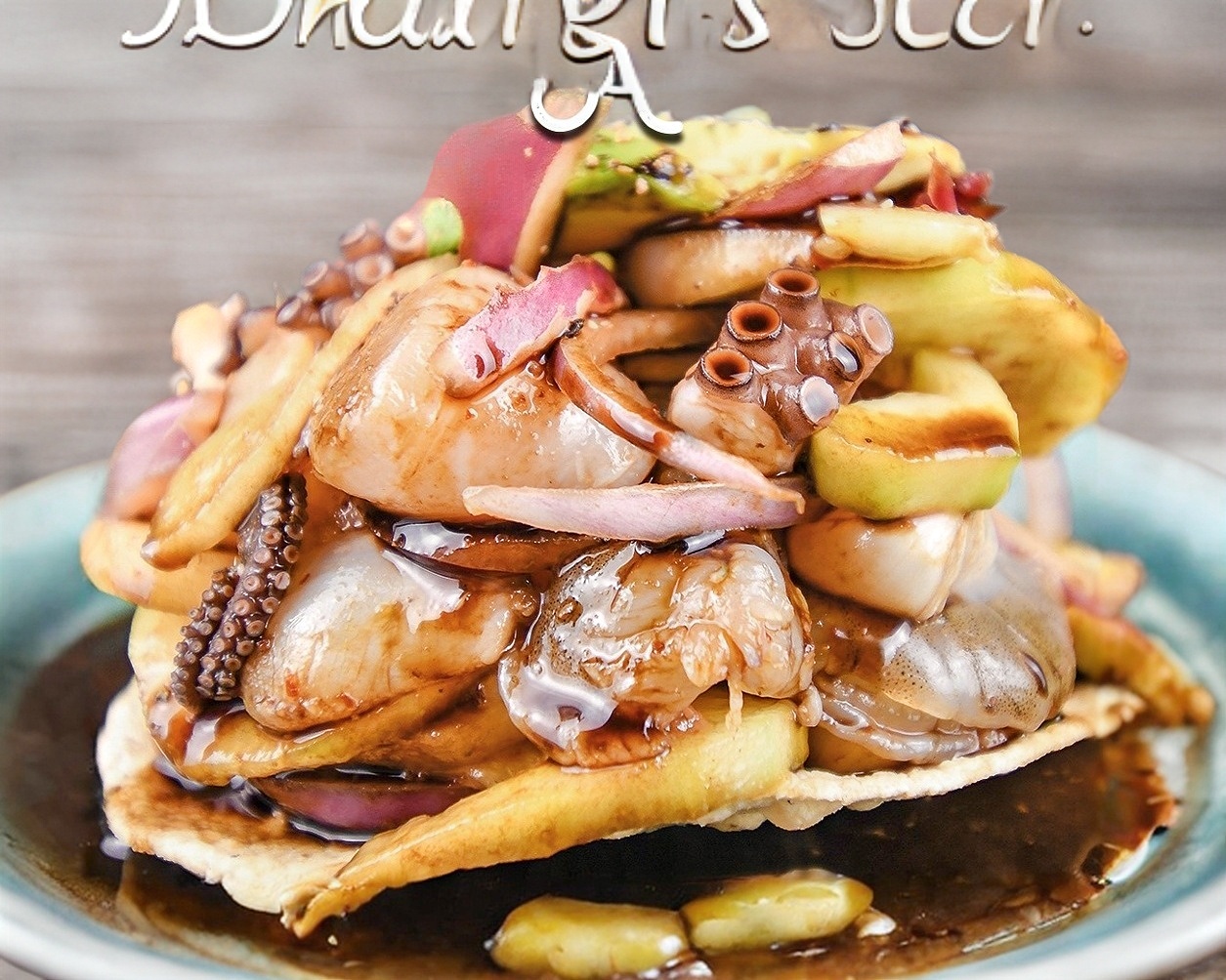 La más latina, con camarón, pulpo, atún y callo (Bañada en salsas negras).