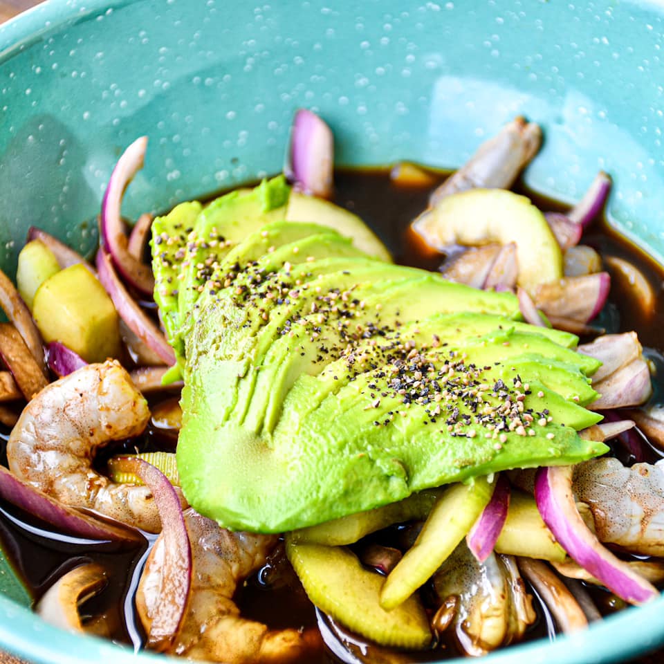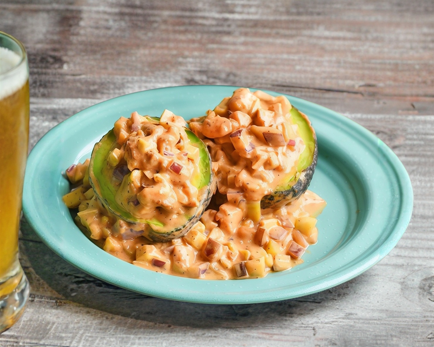 Aguacate (1pza) con topping de ensalada de camarón con aderezo chipotle.