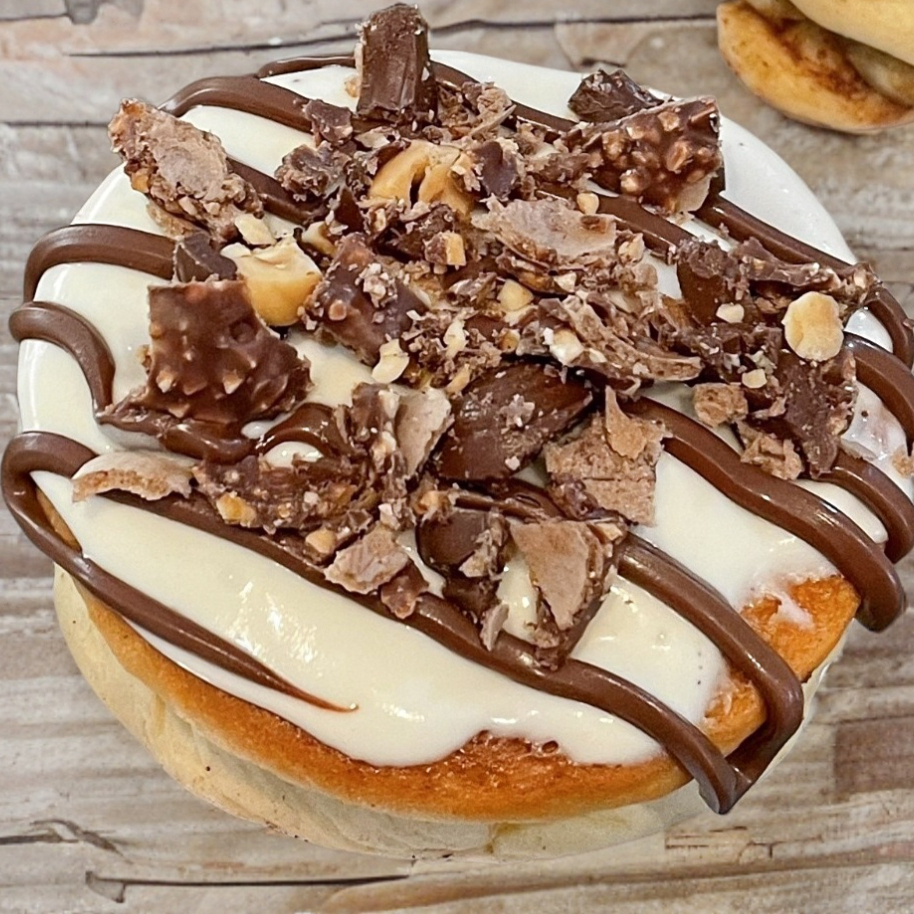 Suave rol de canela, glaseado de queso crema de la casa, Nutella y trozos de Ferrero