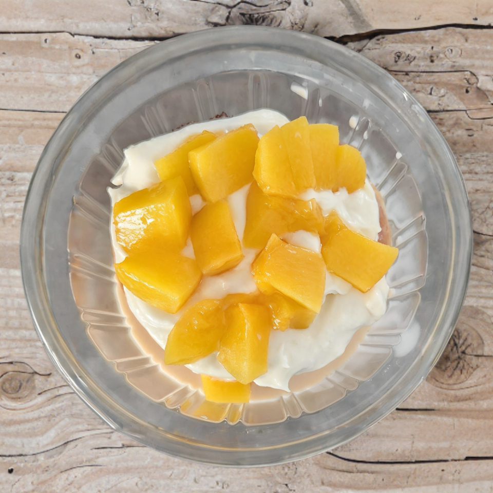 Suave rol bañado en 3 leces, coronado con glaseado de queso crema de la casa y durazno en almíbar