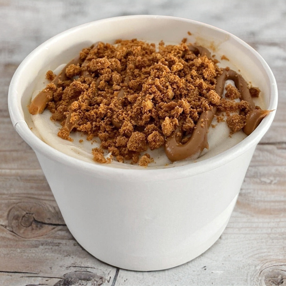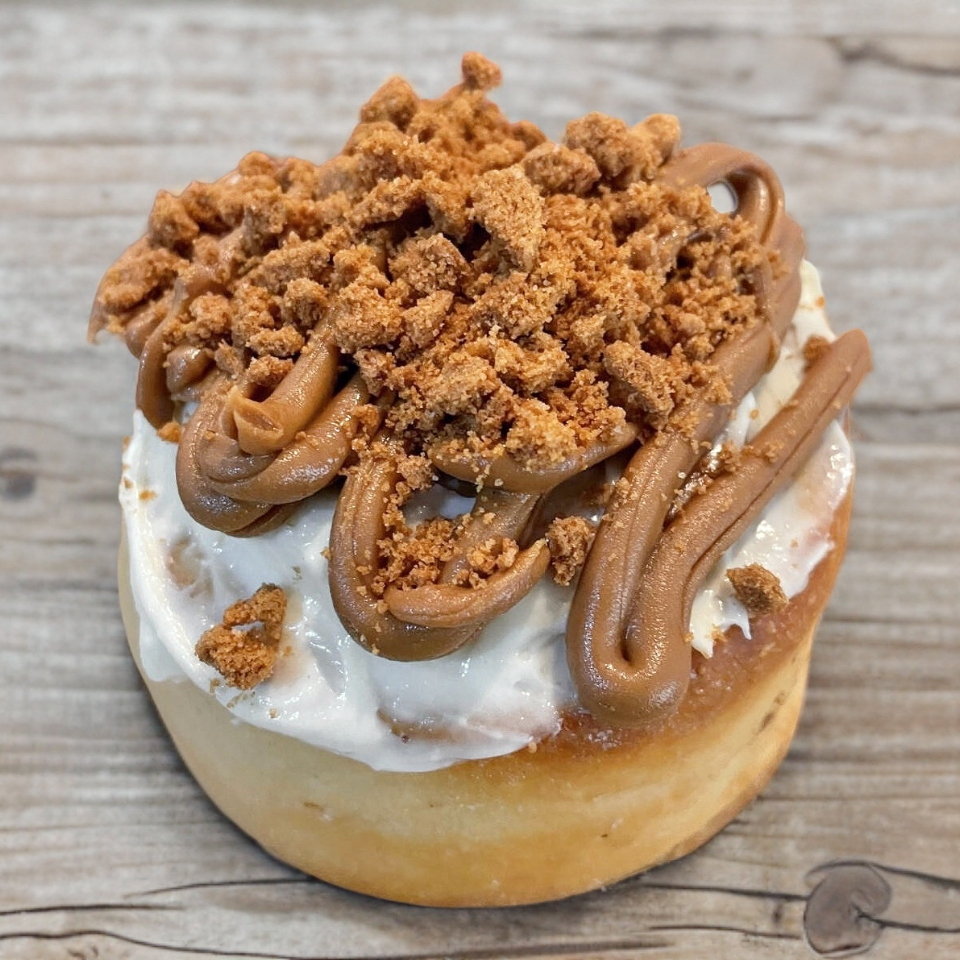 Suave rol de canela, glaseado de queso crema de la casa, spread Biscoff y galleta Lotus triturada