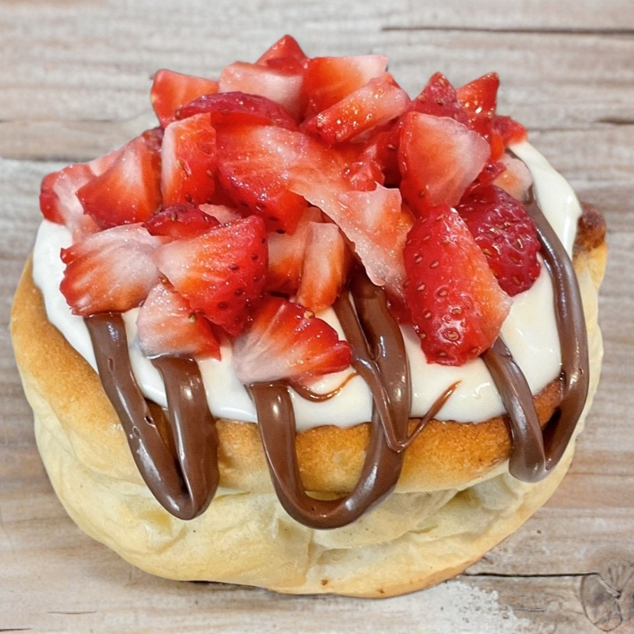 Suave rol de canela, con glaseado de queso crema de la casa, nutela y fresas picadas