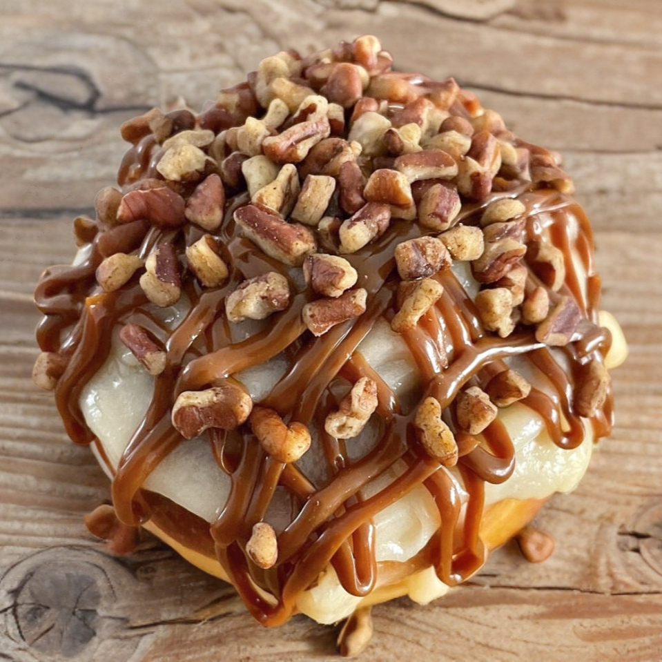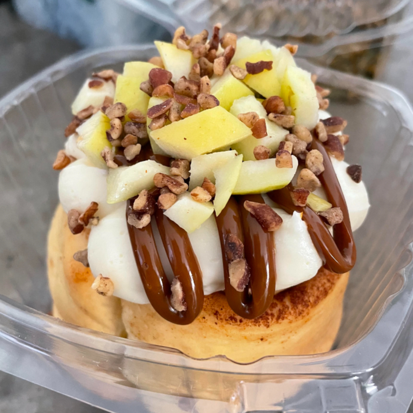 Suave rol de canela, glaseado de queso crema de la casa, dulce de leche y nueces en trozos