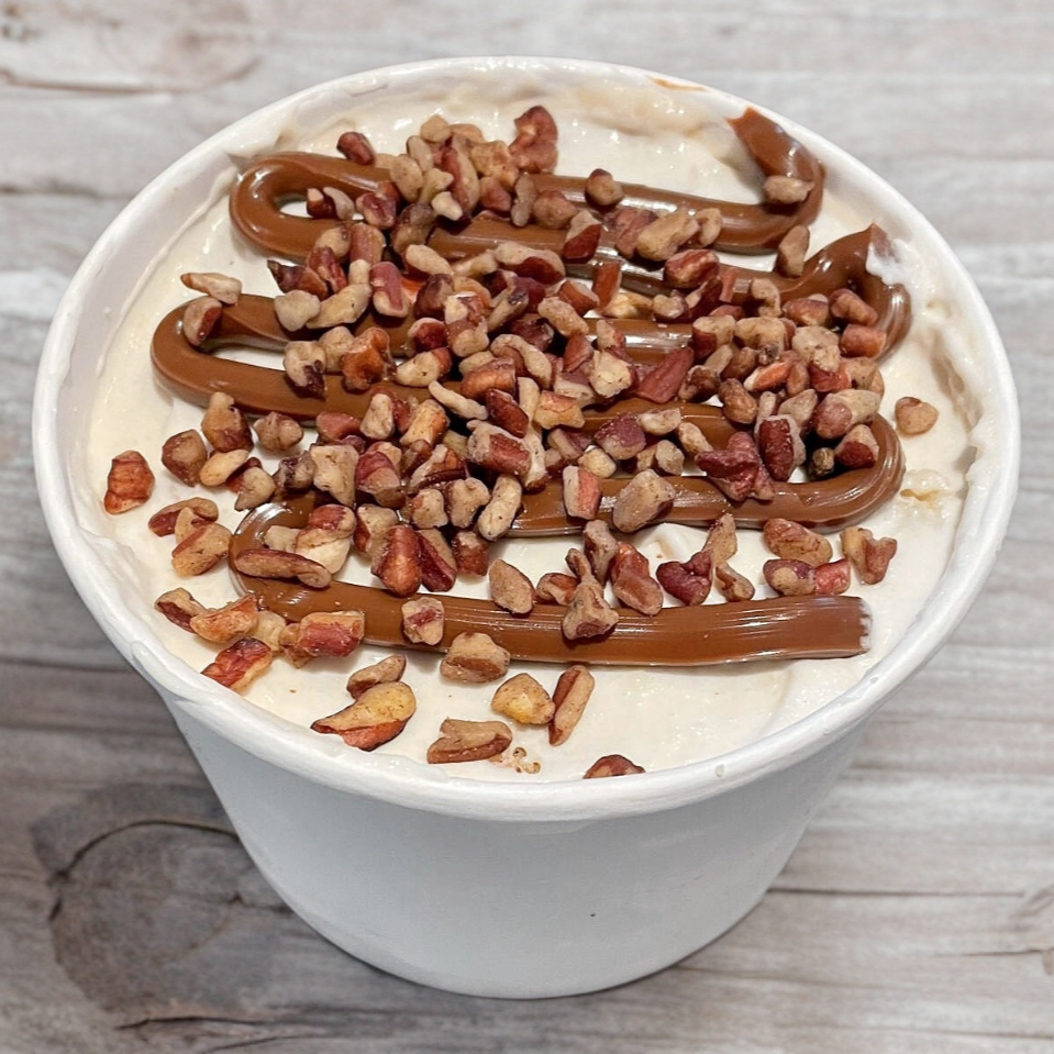 1/2 litro de pastel para cucharear. Pan de vainilla, betún de queso crema, dulce de leche y nueces en trozos