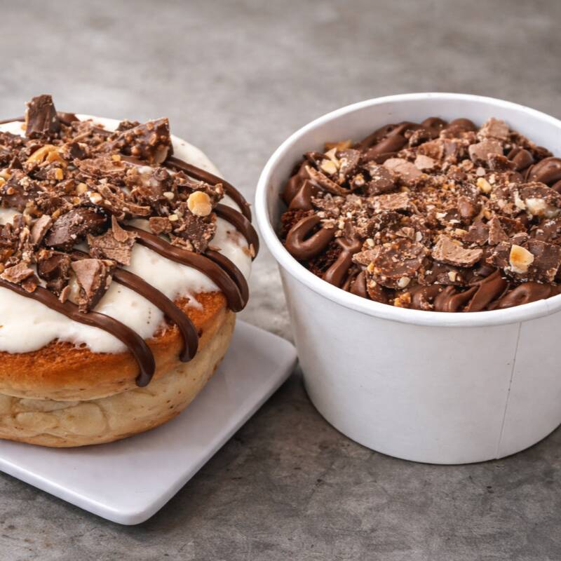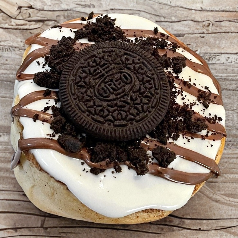 Suave rol de canela, glaseado de queso crema de la casa, ganache de chocolate semiamargo y trozos de galleta Oreo