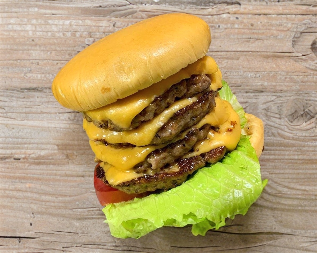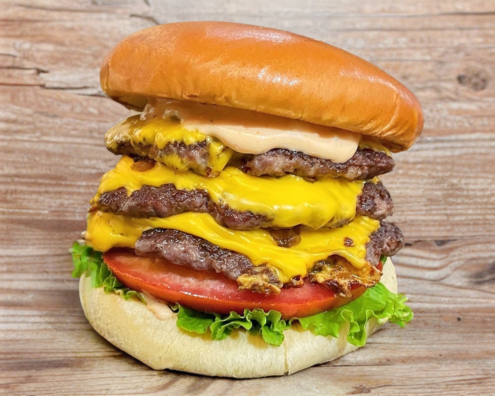 Hamburguesa de 3 carnes(pan brioche, carne de res 300 gr, lechuga, tomate, cebolla caramelizada, aderezo de la casa, triple queso amarillo)