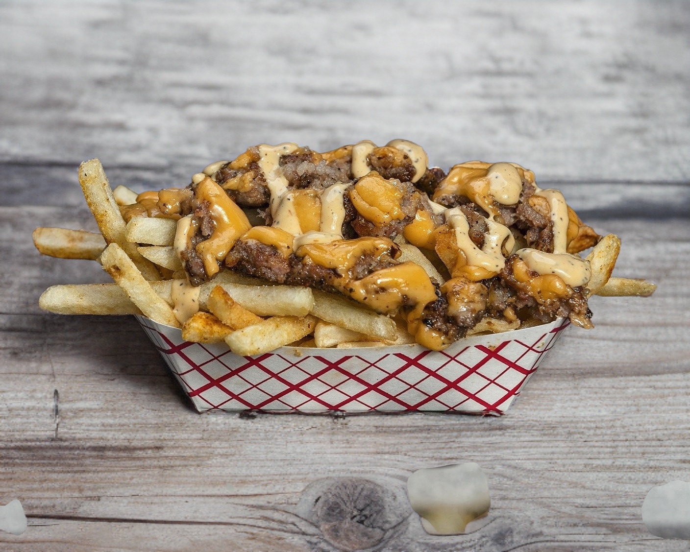 Papas a la francesa 200 gr, queso amarillo, cebolla caramelizada, aderezo secreto y 100 gr de carne de res.
