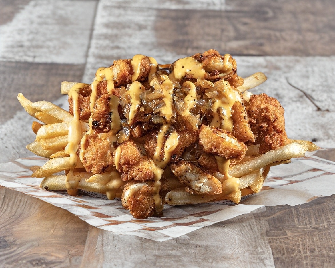 Papas a la francesas 200 gr con queso amarillo, cebolla caramelizada, aderezo de la casa y 100g de pollo empanizado.