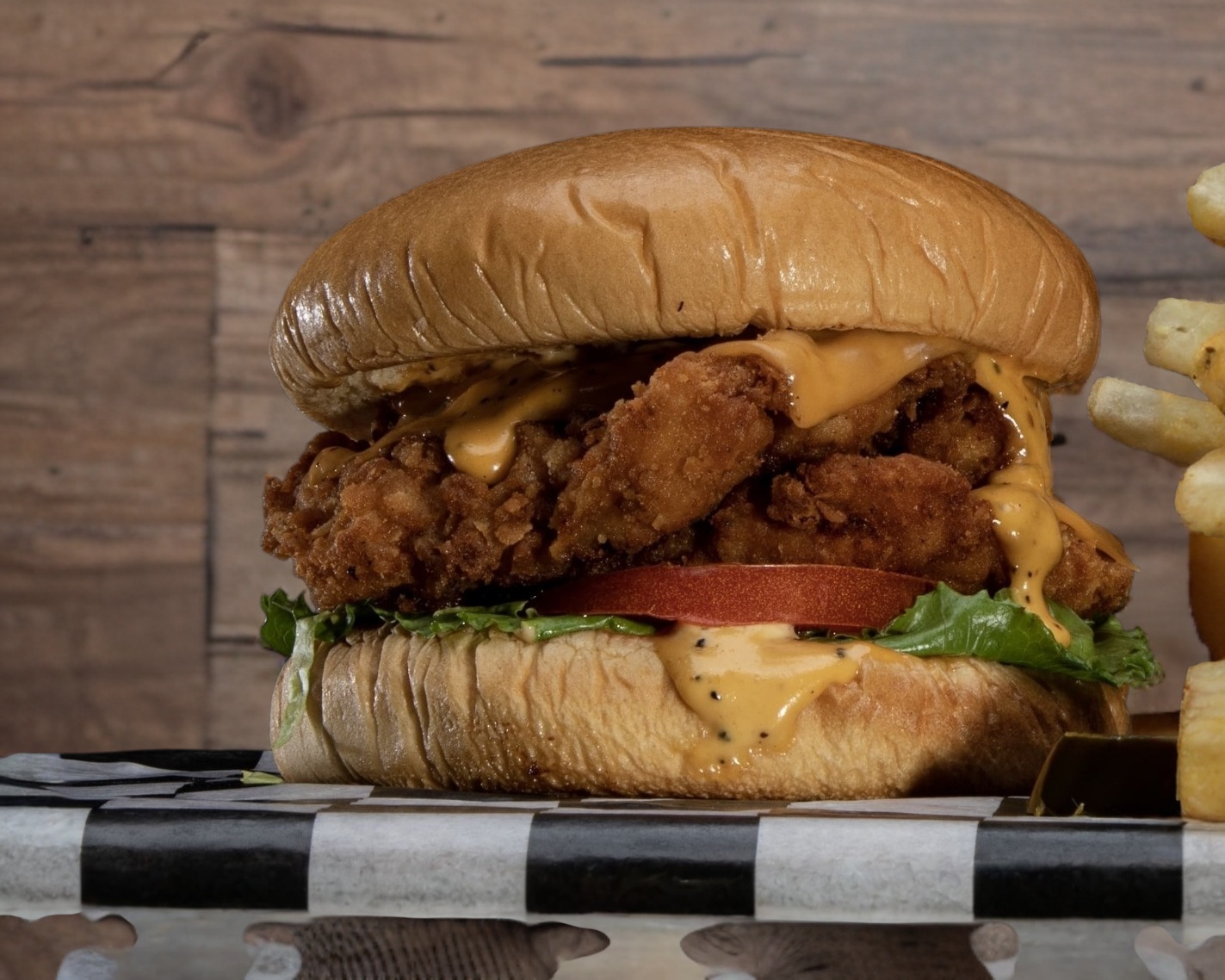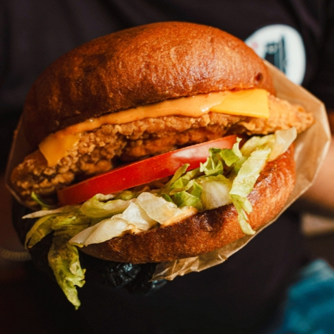 Hamburguesa de pollo (pan brioche, pechuga de pollo empanizado 190 gr, lechuga, tomate, cebolla caramelizada, aderezo de la casa, queso amarillo)