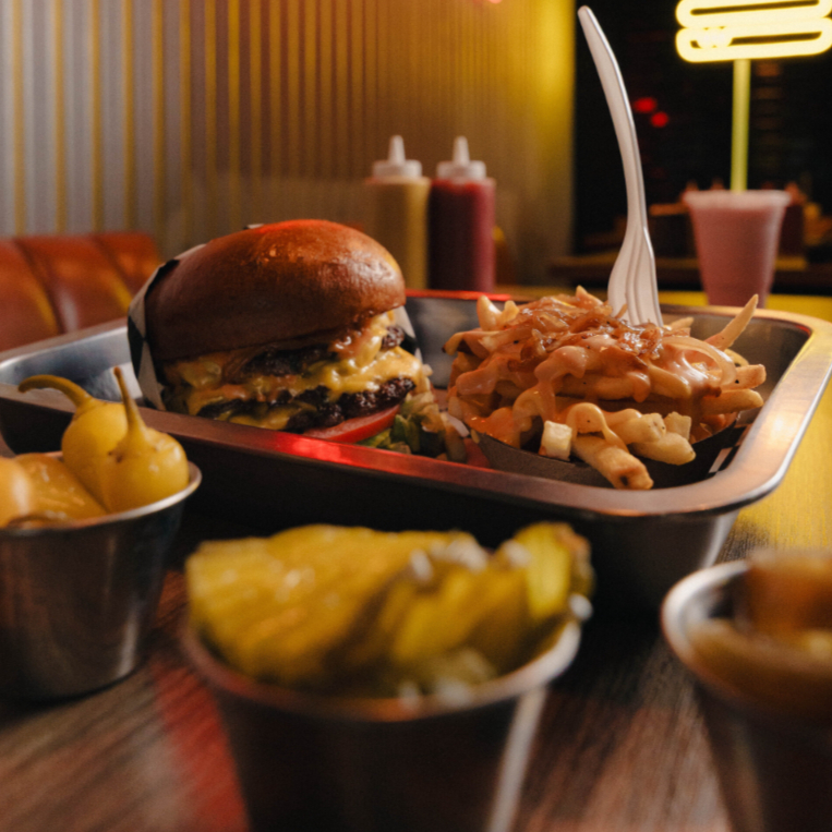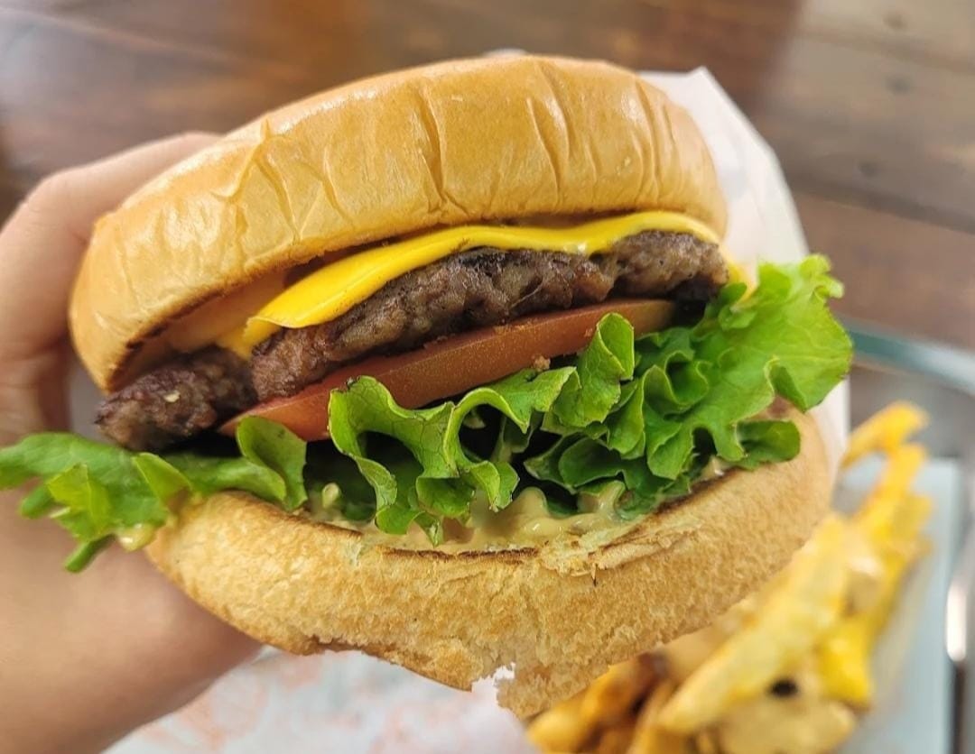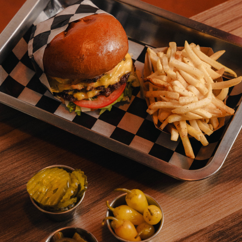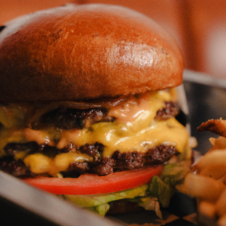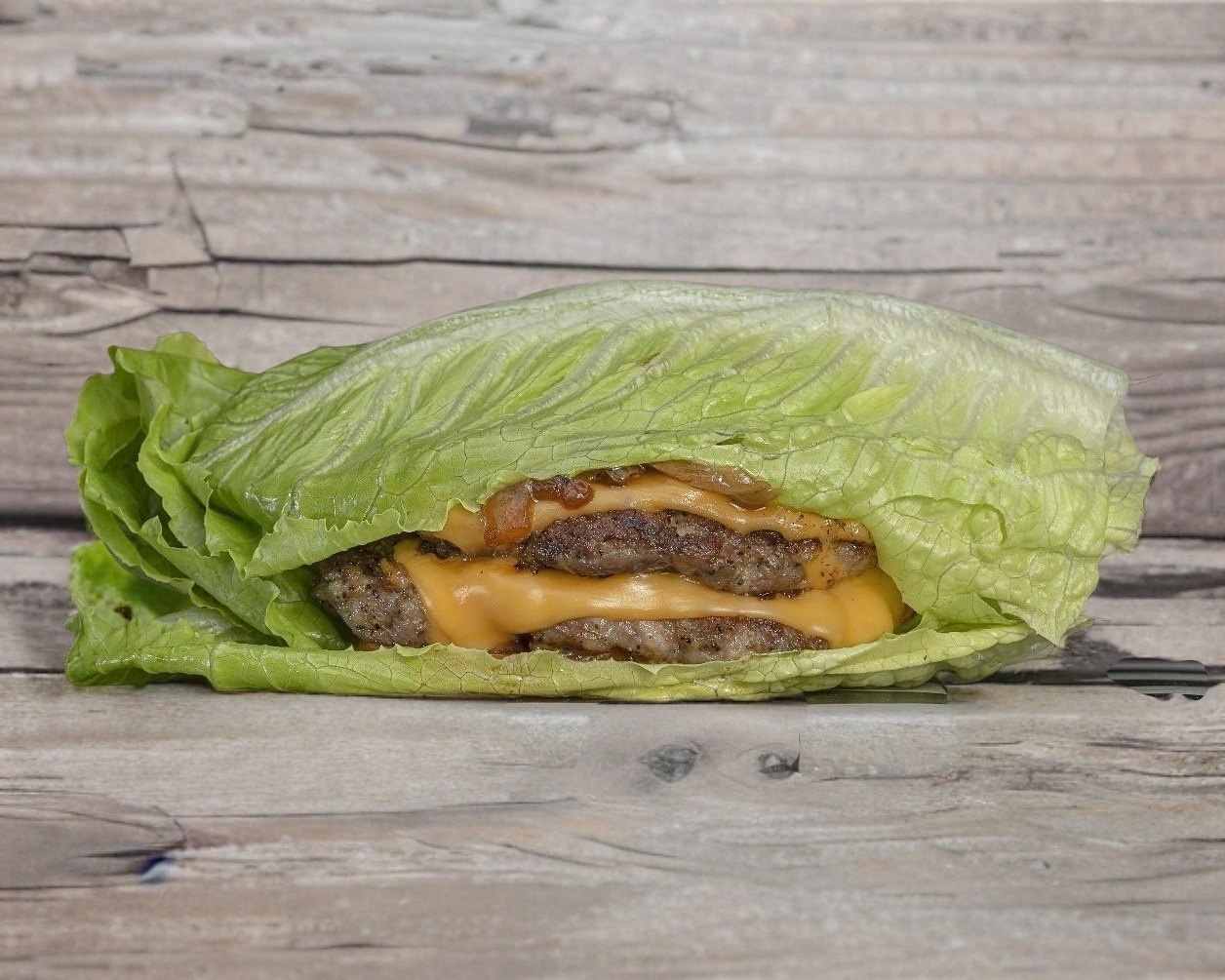 200 gr de carne de res envuelta en lechuga fresca. acompañada de doble queso amarillo, jitomate, cebolla caramelizada y aderezo de la casa.