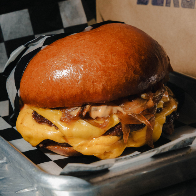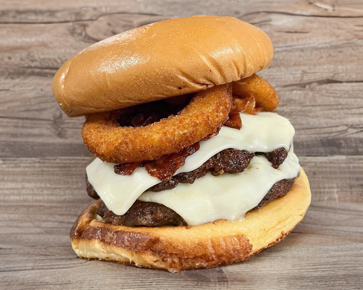Hamburguesa con doble carne (pan brioche, carne de res 200gr, doble queso manchego, aderezo bbq, 3 aros de cebolla caramelizada, tocino)