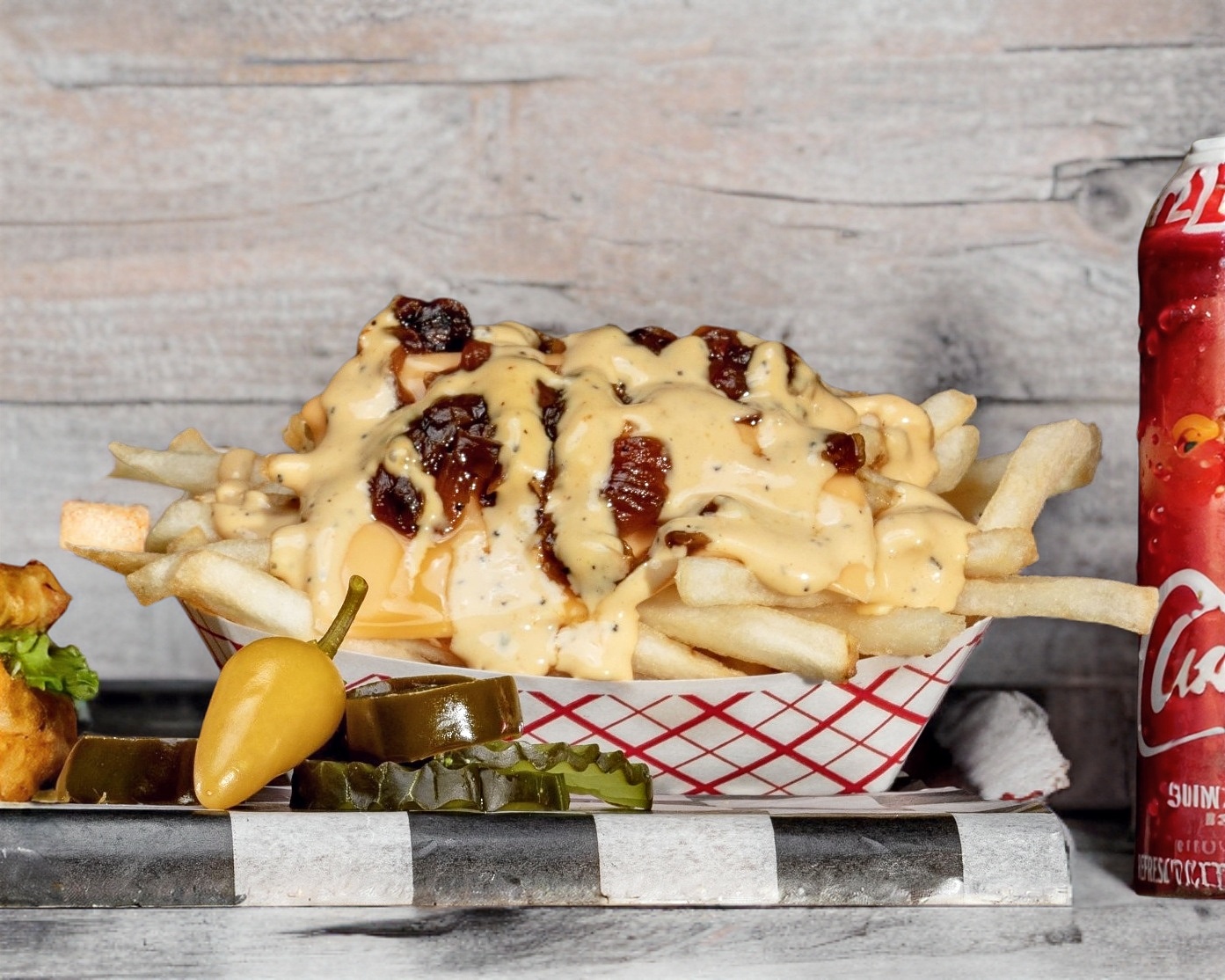 Papas a la francesa 200 gr con queso amarillo, cebolla caramelizada y aderezo secreto.