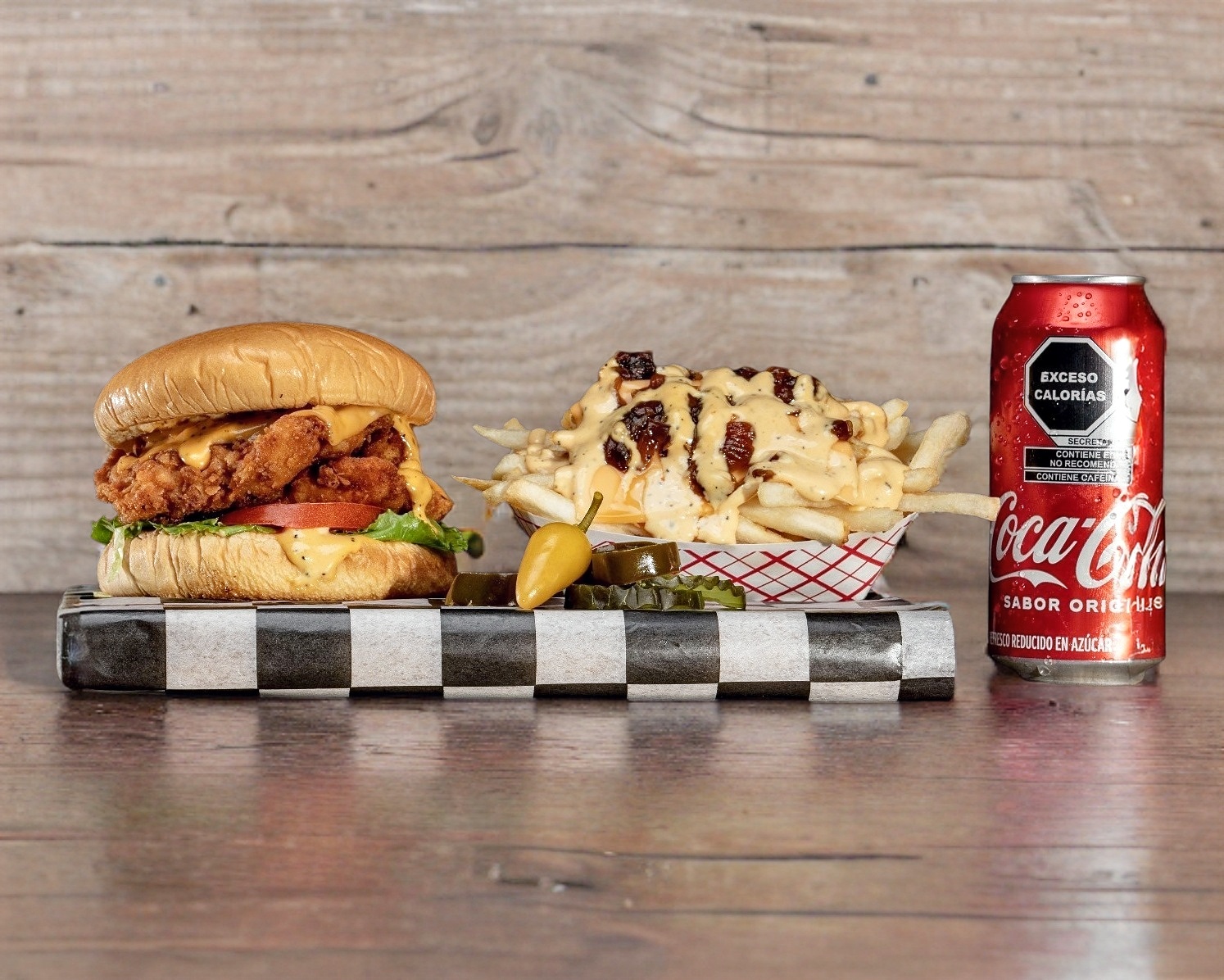 Hamburguesa de pollo (pan brioche, pollo empanizado 190 gr, lechuga, tomate, cebolla caramelizada, aderezo de la casa, queso amarillo)+papas a la francesa sencillas (200gr)+refresco o agua fresca
