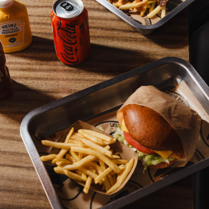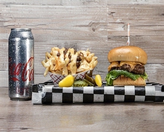 Hamburguesa sencilla (pan brioche, carne de res 100 gr, lechuga, tomate, cebolla caramelizada, aderezo de la casa, queso amarillo)+papas a la francesa sencillas (200gr)+Refresco o Agua Fresca
