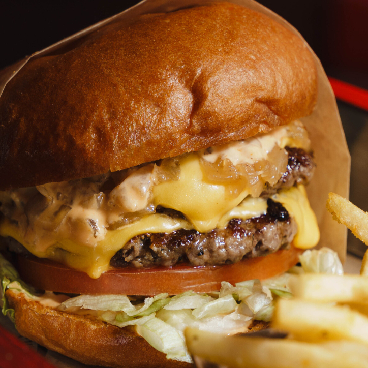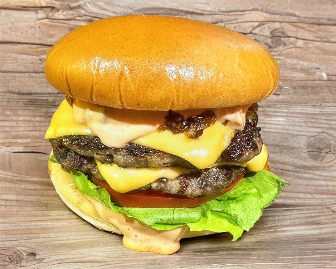 Hamburguesa de doble carne (pan brioche, carne de res 200 gr, cebolla caramelizada, aderezo de la casa, triple queso amarillo)