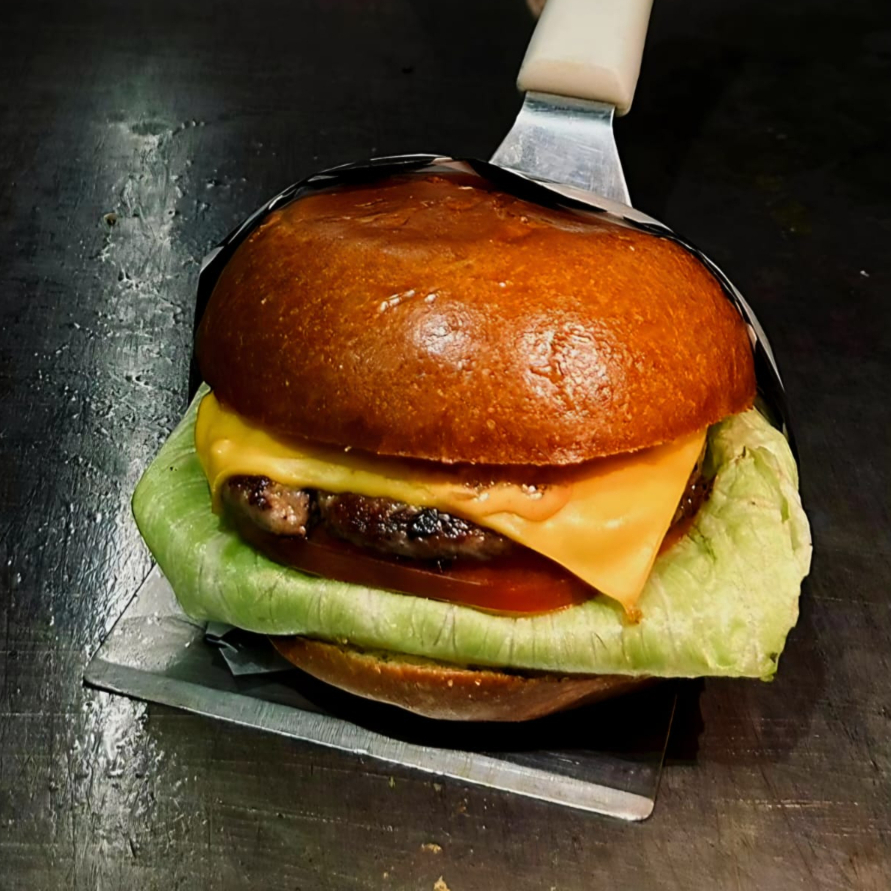 Hamburguesa sencilla (pan brioche, carne de res 100 gr, lechuga, tomate, cebolla caramelizada, aderezo de la casa, queso amarillo)