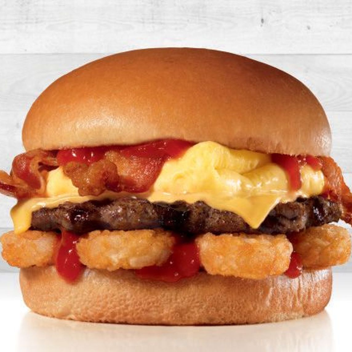 Con carne 100% de res, queso americano, huevo, tocino ahumado, papas hash Brown y salsa Cátsup. Servida en pan recién horneado.