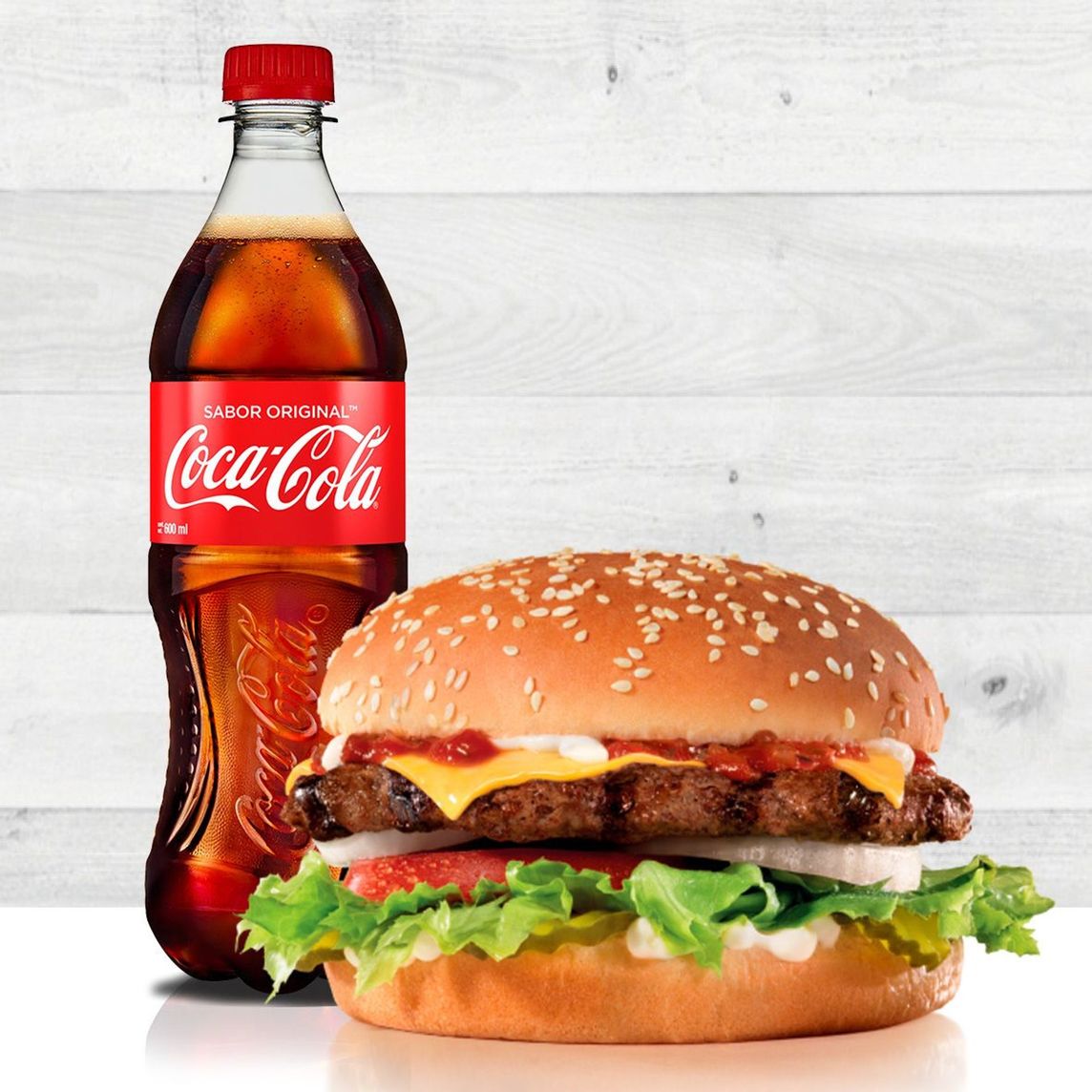 Con doble carne 100% de res, dos rebanadas de queso americano, lechuga, tomate, pepinillos, mayonesa y salsa especial. Servida en pan con ajonjolí.