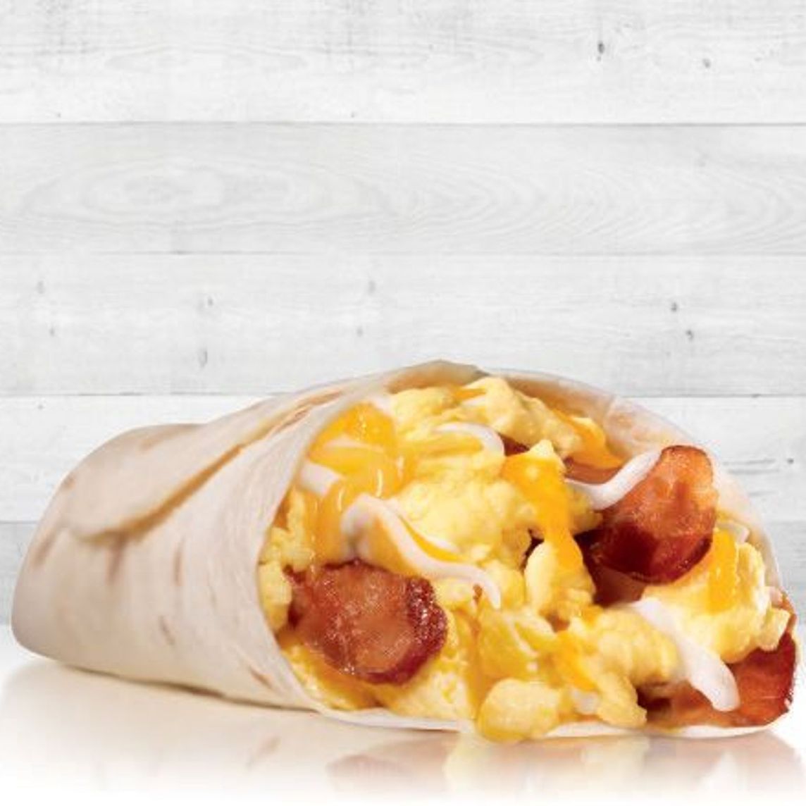 Huevo revuelto con tocino y queso rallado. Envuelto en una tortilla de harina.