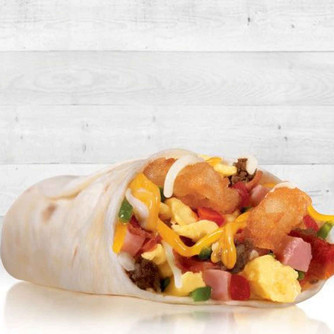 Huevo revuelto con salchicha, jamón y tocino, con papa hash Brown, queso rallado y salsa Pico de Gallo. Envuelto en una tortilla de harina.
