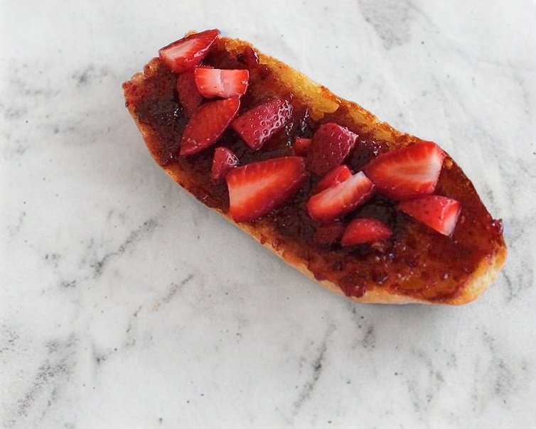 mantequilla, mermelada fresa, fresas picadas/ Presentación de una pieza de una pieza