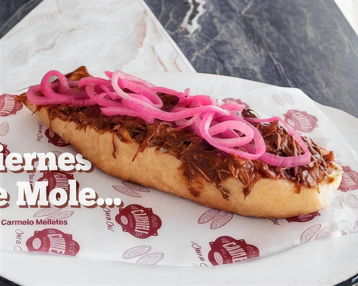mole con pollo, cebolla desflemada/ Presentación de una pieza