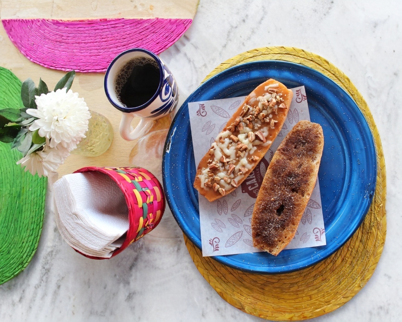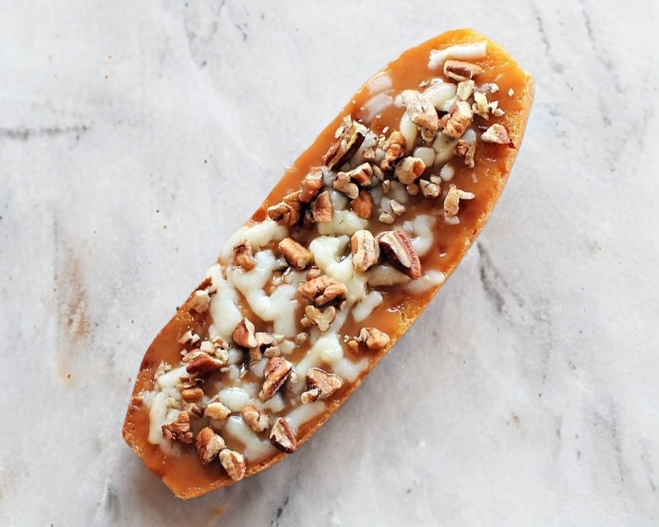 mantequilla, cajeta, nuez picada, queso gratinado/ Presentación de una pieza