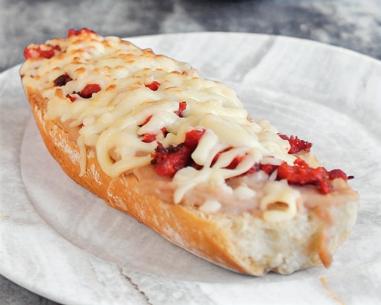 Frijoles, chorizo, gratinado/ Presentación de una pieza